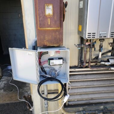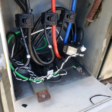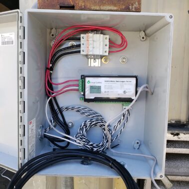 Data is being tracked and recorded by an eGauge metering device in a three-phase configuration and placed inside an outdoor-rated enclosure: